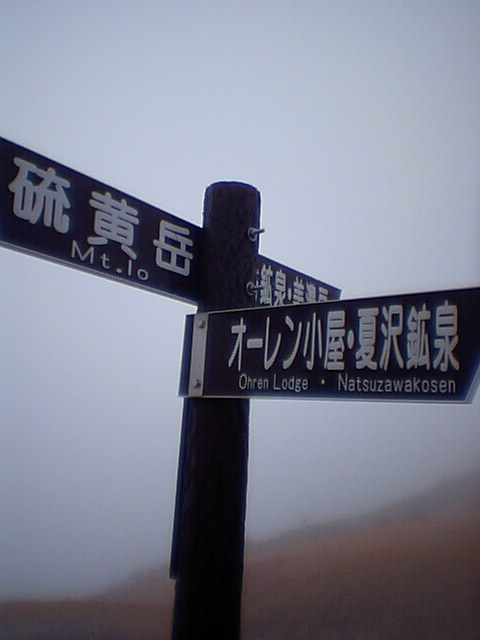 写真は、霧で視界約100mの中、赤岩の頭に設置されている現在の道標。