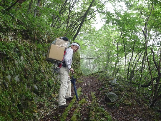 写真は、苔むした石垣積みの良く整備された登山道(峠直下)を行く。