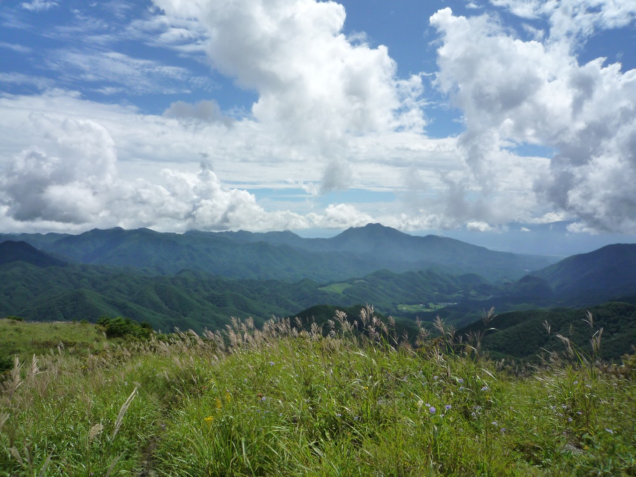 しばらくカラマツ林を登ると足元が見えない位にササが茂る道になり露でズボンが濡れる。1時間、急坂の単調な道に飽きた頃、明るく開けたカヤトの原に出た。