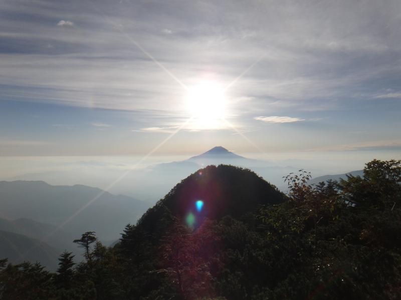 2:00アラームで目覚めたY君に起こされ長い一日が始まる。標高2021mにしては寒さを感じない。テントの結露もない。風もなく静かだ。テントを出て星空を探すが周囲には霧が立ち込め月も見えない。経験的に不安がよぎる。2:50サブザックで出発、少しだけ下って直ぐに昨日とおなじ厳しい急登になる。不安が的中する。辺りはモミ、ツガの原生林が鬱蒼と茂り、昼間でも慎重なルートファインディングが求められる区間だ。霧の中をヘッドランプが照射する限られた範囲の中に赤テープを探しながら、時に木の根を掴みながら這い上がる。急勾配の上に倒木も多く、跨いだり潜ったり、背中の荷物が軽いことが唯一の救いだ。4:10小ピークを過ぎて霧の層を抜けた。満天の星空が広がり、振り返れば南アルプス深南部の彼方に街の灯りも見える。晴天が確証された瞬間だ。やがて左手が地図の危険マークが記す大きなガレ場になり、暗闇の中に吸い込まれないように縁を慎重に歩く。この直後、4:45余りに唐突に布引山の山頂に到着する。静岡県が立てる山頂標柱は立派で、三角点標石の直ぐ脇に建つ。テント場には3張り、その内1張りは中に灯りがある。東の空が白み始めて来たから先を急ごう。5:30コル着、真東に雲海から上がる御来光を拝む。ラスト1ピッチ25分の登り返しでハイマツをかき分けて山頂に、念願の笊ヶ岳に立った。小笊と富士山と太陽が一直線に並び(写真)我々を迎えてくれた。桧横手02:50~笊ヶ岳06:10 3+20