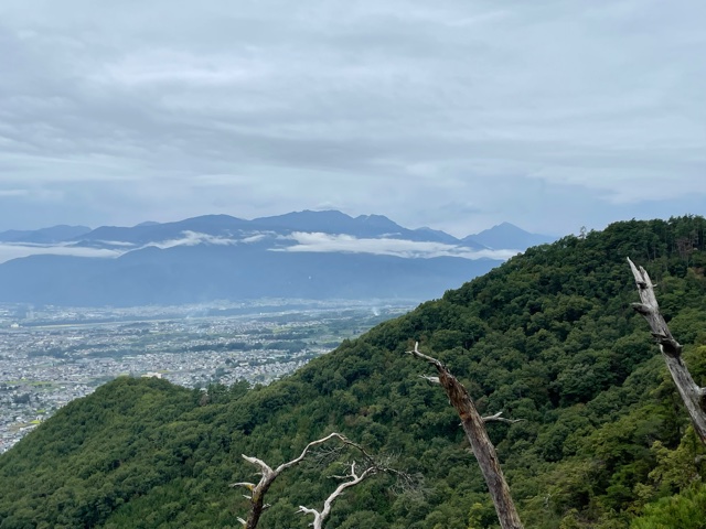 皮肉なことに平日は晴れて、日曜に天気が冴えないパターンが続いている。今日も9時から降り出す予報が出て、予定していた八ヶ岳は中止した。2週続きでハードな登山をやったので今日くらい休みでも良かったが、来月にもっとハードな山行の計画があるので、脚力をキープする週一のトレーニングは欠かせない。折りたたみ傘と水500ccだけ持って、何時ものコースを白山まで往復した。歩き出しは富士山も見えていたが次第に雲が厚くなる。八王子山の手前に甲府盆地の西部方面を見渡す展望台があり、甲斐駒と鳳凰三山(写真)が見えた。僅かな時間だが白山に着く頃には甲斐駒も雲に隠れ、緑ヶ丘の駐車場に戻ると同時に雨が降り出した。緑ヶ丘07:45~白 山08:45 1+00