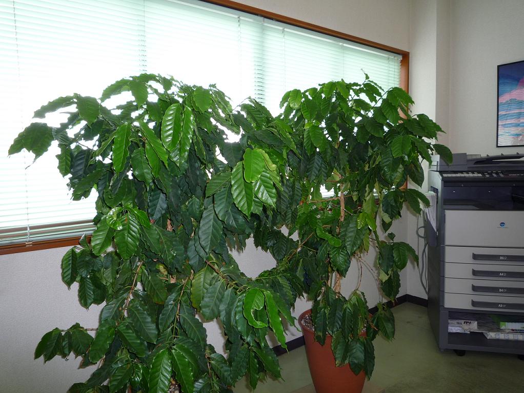 台風18号の接近に備えて大切に育てているコーヒーの木を店先から3階の事務所に避難させました。外に置いていた時はさほど感じませんでしたが、室内に入れてみてその大きさ(コピー機と比較)に驚きました。樹高は1m50cmに成長し、9月にワンサイズ大きな鉢に植え替えた事もあって自宅へ運ぶのが困難になってしまいました。昨日は富士山で初冠雪の便りも有りましたので、このまま事務所の南に面した窓際で冬ごもりに入りたいと思います。