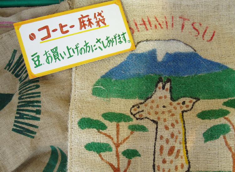 コーヒーの生豆が入ってくる麻の袋には色々なデザインが描かれています。写真はタンザニア産で、キリマンジャロ山とキリンさんの長い首がアフリカの大自然を表現しています。豆をお買い上げのお客様に無料で差し上げていますが、Tさんは埼玉のお孫さんに送ってあげたところ、保育園の恒例行事で裏山に落ち葉拾いに出かけた際に重宝されたそうです。園に戻ってキリンさんの落ち葉で焼いた芋が子供達に大人気だったそうで、嬉しそうに焼き芋をほお張る子供達の光景が目に浮びました。
