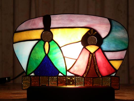 西洋の芸術文化ステンドグラスで日本の伝統美を表現することをテーマにお雛様を制作しました。サイズは、幅25cm×高さ15cmで外形をぼんぼりをイメージした扇形にして、明かりが灯った雰囲気に背面から25Wの白熱球でライティングしています。背景色は桃や菜の花と春霞の空をウロボロス社(アメリカ製)ガラスで表現し女雛の着物にはアンティークガラス(ドイツ製)を使用して高貴な気品を醸し出しています。ひな祭りには少し早いですが今日から店内に展示しましたのでコーヒーを飲みながらステンドグラスのお雛様を是非ご覧ください。この後、3月7日(水)~3月12日(月)まで甲府駅前の山交デパート5Fの文化教室特設会場で教室の講師やほかの生徒さんの多数の作品と共に展示されます。また、11日(日)には初心者のステンドグラス体験教室も開催されますので興味のある方は当店までお問い合わせください。