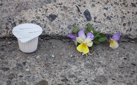 東北関東大震災において、被災された皆様に心からお見舞いを申し上げます。店の駐車場と道路の境目の僅かな隙間(2ヶ所)にビオラが咲きました。昨年の種がこぼれて自然に芽が出たものです。ポーションミルクと大きさを比較してください。小さくてもたくましい命です。もうすぐ4月、各地から桜の便りも届いています。被災地にも一日も早く暖かい春風が吹くことを願っています。