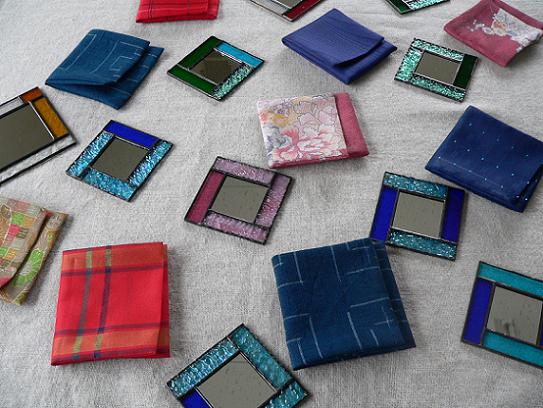 昨年の5月に丸川荘の只木さんと始めた被災地を応援する「森のランプ」の活動は、その趣旨に賛同して協力してくれる方が増えてきました。璃房ステンドグラス東京教室のスタッフの方と甲府教室の先輩Kさんが、それぞれミラーと着物の生地で作ったケースを提供してくださいました。ミラーは7cm角が9枚と10cm角が2枚、ケースは7cm角用が10枚です。写真では質感がお伝え出来ませんが、ステンドグラスのレトロな雰囲気と、着物生地ケースの懐かしさを感じる風合いがとても調和しています。10cm角のミラーは鎖を付けて壁掛け用(1300円)に、7cm角のミラーはケースとセットにして携帯用(600円)にお使い頂けます。今回も売り上げは全額を支援金として被災地で活躍しているボランティア団体にお送り致します。なお、1月から制作していました10cm角の壁掛けミラー20枚は3月10日までに完売して現在追加のご注文分を制作中です。日々の小さな活動も皆様のご協力により少しずつ形になってきている事に感謝し、これからも長期的に「森のランプ」の活動を継続して行きたいと思っています。今後ともよろしくお願い致します。