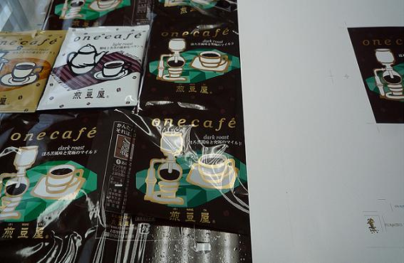 4月19日発売予定の One Cafe ダークローストは、震災の影響でパッケージフィルムが品薄状態になり、発売延期が危ぶまれましたが、震災前に発注してあったミディアムロースト分のフィルムを半分使用して印刷する事になり、今回も名古屋の印刷メーカーまで出向き色合わせに立ち合いました。ライト・ミディアム・ダークと3段階の味を、色合いで表現するパッケージデザインなので妥協は許されません。4版4色に網掛けを合わせると8色を確認する作業になりますが、自分の目で見て納得した色で印刷してパッケージにも中身同様の魂を吹き込みたかったからです。写真はテスト刷りのダークローストのフィルムでグリーンを刷り直してOKした所、この後本番フィルムに印刷して再度確認しました。さすが大手メーカーならではの技術力と品質に大満足の仕上がりでした。この後、アルミ蒸着~エイジングの1週間の工程を経て14日に横浜の充填加工メーカーに搬入され、予定通り19日に One Cafe ダークローストが発売できます。
