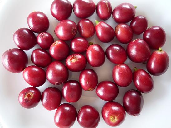 昨年の夏に満開に咲いたコーヒーの花が沢山の実を付け自宅で越冬して収穫の時を迎えました。チェリーレッドに完熟した実を摘み取り外皮をはいで黄色い果肉をかじってみると、甘い果汁が口の中に広がりました。果肉を水で洗い流すと中心には立派に成長した一対の種子が、パーチメント(内果皮)に包まれて入っています。ご存知だったでしょうか?コーヒー豆とは果実の種のことなのです。サクランボや梅は果肉を利用して種は廃棄しますが、反対にコーヒーは種に価値があるのです。これから一週間ほど天日乾燥をしてカラカラに乾いたパーチメントをはがせば原料豆(コーヒー生豆)の完成です。