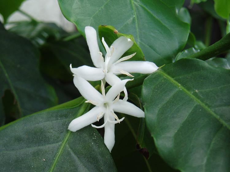 10日前に小さな花芽を見つけて以来、亜熱帯の気候を感じさせるコーヒーの生育には 理想的な高温多湿の毎日が続いていました。肥料を与え、水やりを一日おきに増やし毎日楽しみに観察して来ましたが、ついに今朝一度に6輪もが大きく開花しました。色濃くなった緑の葉に寄り添い、まるで砂糖菓子の様な純白の花弁からは甘い香りが漂いトロピカルな雰囲気にしばらく酔い痴れてしまいました。思えばコーヒー屋を始めて20年、コーヒーに明け暮れた6935日の中で今日は特別な一日になりました。それは『 何事も一生懸命に続けて行けば必ず花開く時が来る 』と、初めて自分で育てたコーヒーの花から教わった事です。次回は真っ赤に熟したコーヒーの実をお伝えしたいと思います。