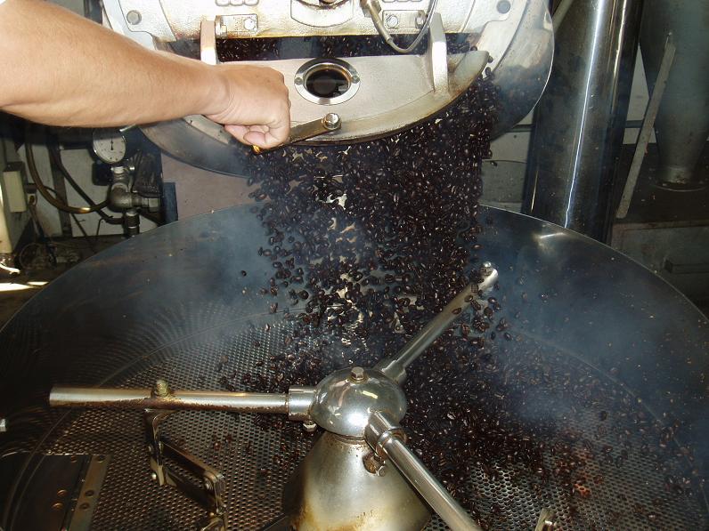 今週の話題は猛暑~落雷~停電~そんな毎日でした。この暑さで急増したアイスコーヒーの注文に対応するため煎豆屋の焙煎機は連日4~5時間連続稼動で熱気と煙に包まれています。今日もアイスとホット合わせて約100sの注文が入り、停電のリスクが高い午後を避けて早朝から焙煎作業を始めました。この時期が作業者にとっては一番過酷な季節で、排熱のために吹き抜けにした焙煎スペースでも朝から室温は30℃を超え、焙煎豆の冷却を助ける工業用の扇風機がブーンと音を立てて回ります。 午前11時30分(室温37℃)に本日12釜目の焙煎が終りました。 写真は、230℃の釜から煎り上ったアイスコーヒーを取り出す瞬間で作業者は集中している為か暑さを感じていません。