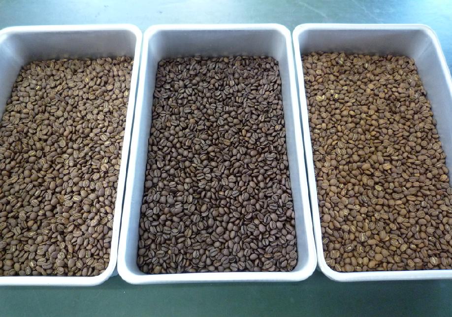 お客様からブレンドにはどんな豆がミックスされていますか?と質問が度々あります。コーヒーの味作りで重要な役割を担っているブレンドに関心を示すお客様が増えている事に嬉しさを感じますが、ブレンドを説明する時に切り離すことが出来ないのが焙煎です。 そこで今日からシリーズで、焙煎にも触れながらブレンドについて説明させて頂きます。コーヒーは、銘柄や産地ごとに味の特徴が違う事は皆さんご存知と思いますが、同じ豆でも焙煎によって味が変る事を知っていますか?一般に浅煎りの酸味から焙煎が深くなるにつれて苦味が強くなって行きます。ですから酸味が特徴のモカは浅煎り、苦味が魅力のマンデリンは深煎りと言う風に、それぞれの個性を最大限に引き出す度合いに焙煎をコントロールします。この焙煎を「単品焙煎」、焙煎後にブレンドする事をアフターミックスと呼び、煎豆屋ではゴールデンブレンドとイタリアンブレンド以外がすべてこの方式です。ブレンド作りは出来上った味をイメージする所から始まり、基本になる豆(主役)と味を調える豆(脇役)が互いの長所を引き出し、欠点を補いながら味の幅と奥行きを広げて行きます。 つづく・・・。写真は、やや深煎りサントス(中央)・浅煎りホンジュラス(右)・中煎りコロンビア(左)です。次回は人気のロイヤルブレンド誕生の秘話です・・・お楽しみに!