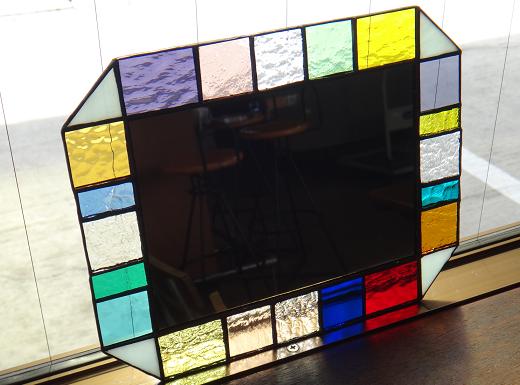 丸川荘の只木さんと続けている東日本大震災の被災地を支援する「森のランプ」の活動は16ヶ月を経過しました。この間に多くの皆様に作品を購入して頂き、その売上げは全額を被災地で活動するボランティアに支援金として贈って来ました。今日は8月26日に丸川峠に登った時にお預かりした募金のお礼として制作したミラーが完成し、店の窓辺に置いて光を透過した時の表情を写真に記録しました。制作には2週間を要しましたが、その大半はガラス選びと色の組み合わせで、贈り先さまの好みを想像しながら試行錯誤の繰り返しで、形こそシンプルですがその仕上がりには大変満足しています。気に入った作品が手元から離れて行くのは寂しい気持ちですが、先方のお宅でステンドグラスの不思議な魅力を放ってくれたら嬉しく思います。