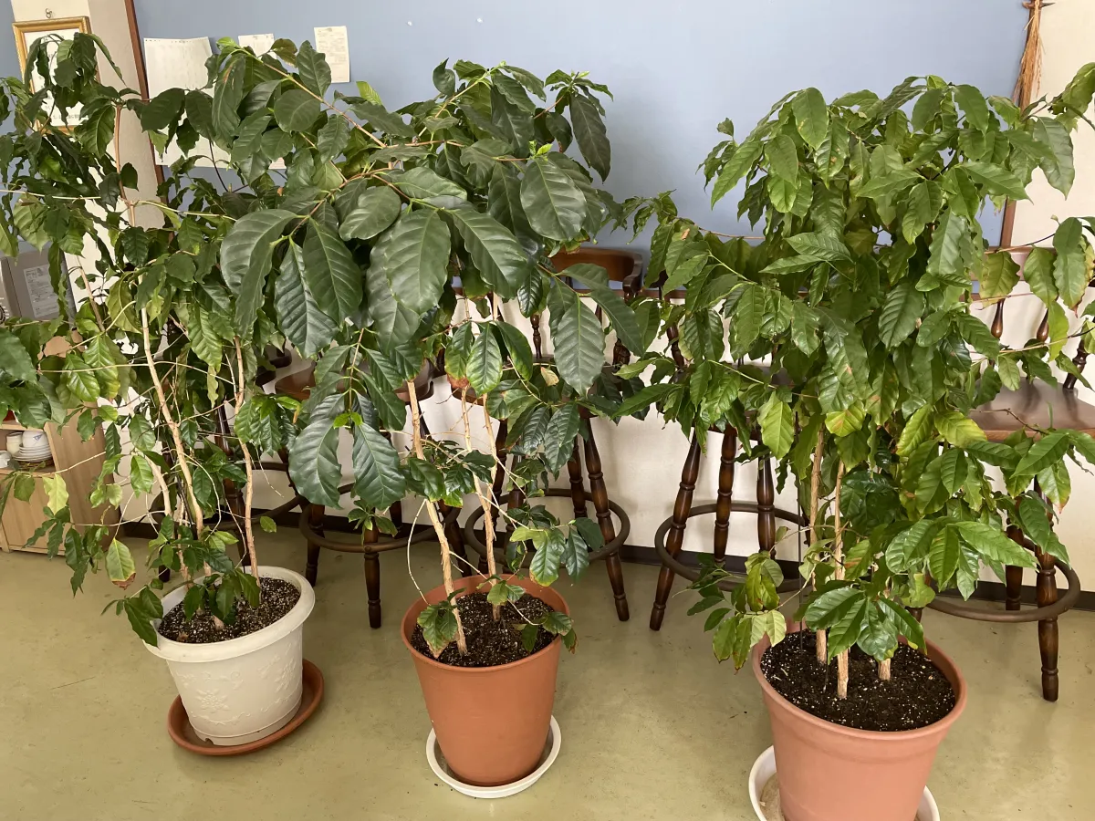 4月11日、甲府では最高気温が29℃まで上がり汗ばむ暑さとなりました。気温の上昇に伴ないコーヒーの木を越冬のため空調で管理された狭い部屋から、ゆったり広い事務所に移動させました。窓ガラス越しでも、外光が入るので葉の緑も一段と鮮やかに見えます。若葉も順調に芽吹きだしています。連休のどこかでサイズアップの植替えを予定しています。その後しばらく様子を見て施肥を行い、さらに剪定の作業と忙しい季節を迎えます。