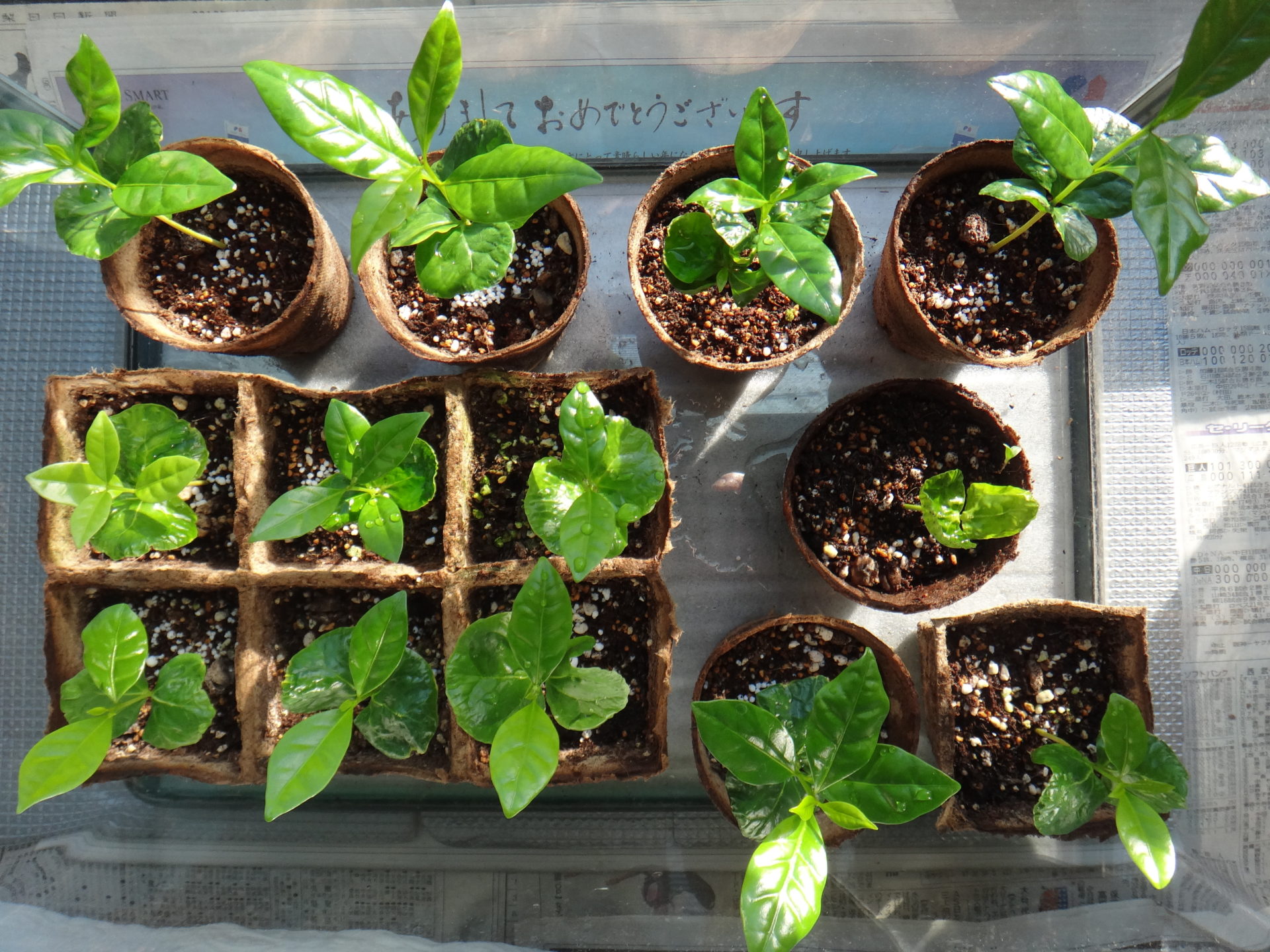 1月5日、穏やかな晴天の正月が続いております。12月中旬に保育器に移して特別に管理した末っ子は、大切にした甲斐があり見事に子葉が開きました。まだまだ油断は出来ませんが、今日から兄弟と一緒の温室に戻して様子を見ることにしました。日当たりの良い2階の窓辺に置いた温室の中、右側の真ん中に居るのが末っ子です。温室内の温度計は33℃もあり全体に元気な若葉色に輝いていますが、土が完全に乾いていましたので、何時もより多めに水やりをしました。よく観察してみると成長の早い子たちは、ポットの底から根が飛び出していました。土の中を掘って観察することはできませんが、寒いこの季節には葉の成長を抑え、懸命に根を張っているようです。こんな小さな子供たちですがコーヒーの強い生命力を感じます。
