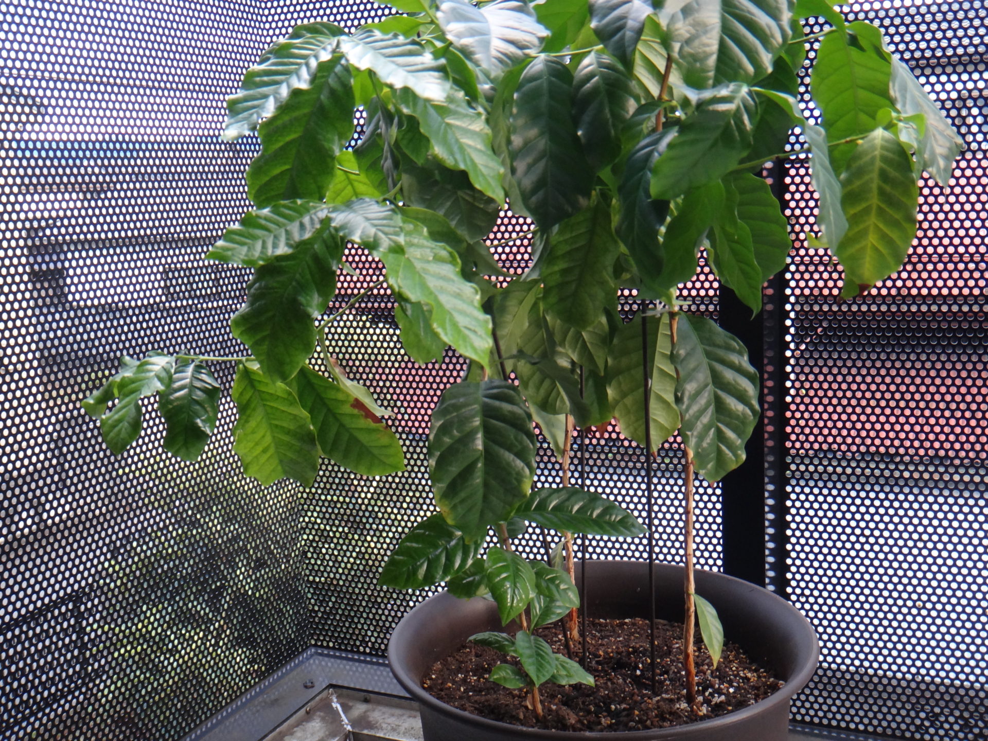 10月17日、昨日までの残暑が嘘のように気温が急降下、等圧線は縦縞で典型的な冬型の気圧配置になりました。早朝の冷たい雨は9時頃には止みましたが、その後の北西風に冬の到来を感じた一日でした。さて心配なコーヒーの子供たちですが、生育停滞期のまま変化がない状態が続いていました。恐らく気温がダラダラと変化なく季節を感じなかったからでしょう。だから今日の急降下でスイッチが入る事を期待したいと思います。今日は一月遅れの植替え作業を行いました。用意した鉢は10号サイズで成長が一番の双子ちゃんには寄せ植えは狭いので、中位の3兄弟を選び均等な間隔に並べて植替えました。ポイントは水はけを良くする赤玉を5cm敷いて、土も観葉植物用の少し上等な物を使いました。ただ急激に寒くなって心配なので、今日はこの3兄弟だけで他は様子見とします。