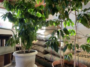 11月19日、短かった秋が終わり全国的に今季一番の冷え込みとなりました。予報で分かっていたのでコーヒーの木は昨夜の内に駐車場から店内に移動させました。甲府では最低気温が4℃まで下がり危険な寒さでした。経験的に5℃以下の環境ではコーヒーは枯れてしまいます。今まで数々の失敗を重ねて来たので、種から栽培しているこの子たちは絶対に枯らせる訳にはいきません。台車に積んで店内へ(写真)この後は3階の事務所に移動します。