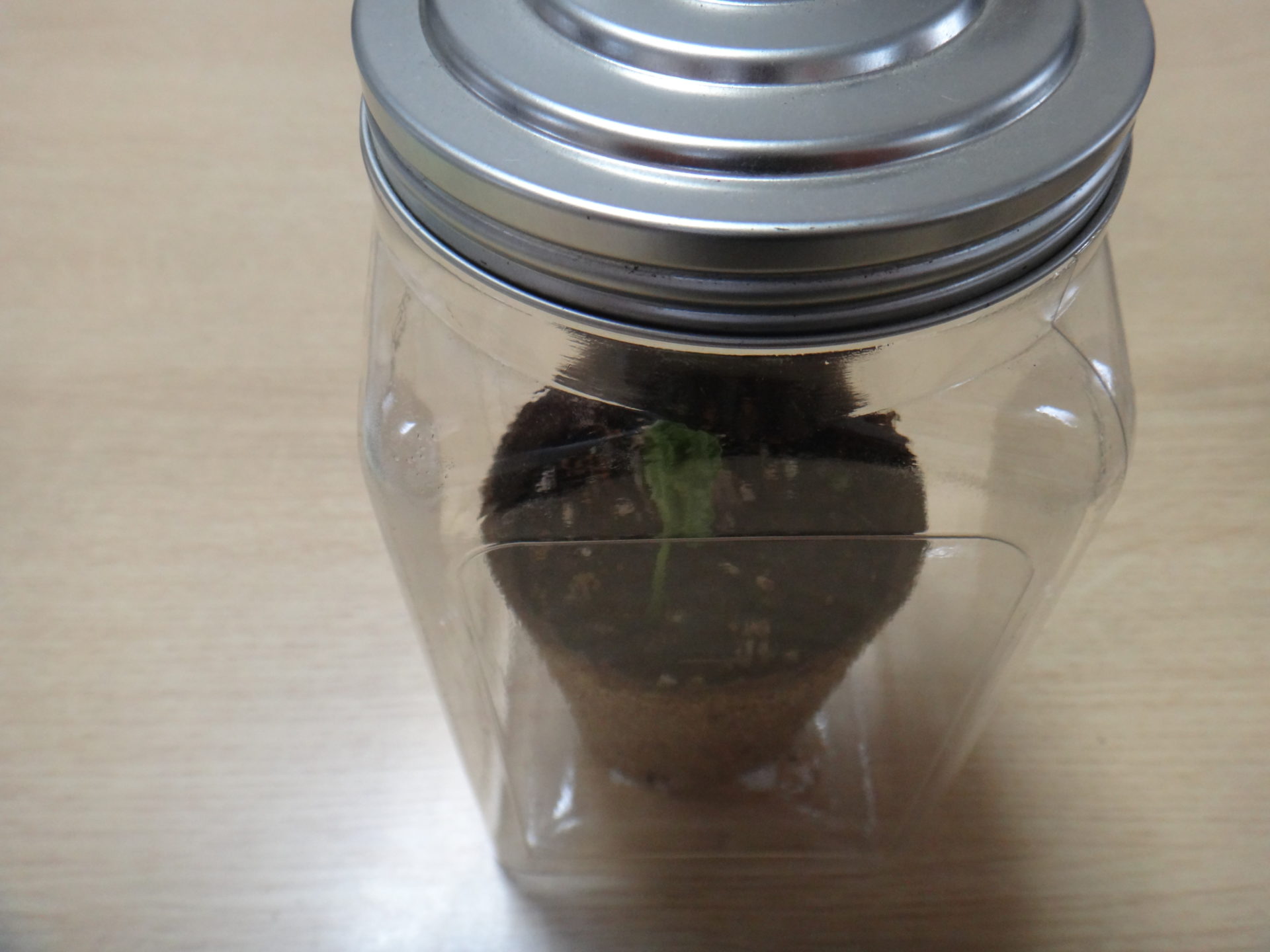 12月19日、時おり雲間から日も差しましたが底冷えの寒い一日でした。心配な末っ子はパーチメントの殻を剥ぎ取ってあげても身長4cmのまま、子葉が開く様子もなく完全に成長が止まっています。このままでは寒い冬を乗り切れず枯れてしまいそうです。生まれたばかりの小さな命を何とか救ってあげたい。そこで今日から、保育器(駄菓子のプラ容器)に入れて特別な環境で育てる事にしました。先ずは温度管理の対策です。日中は南向きの出窓で20℃を、夜間は底面に湯たんぽを敷いた保冷バッグに入れて15℃をキープ出来るように工夫します。あとは僅かに肥料を与え様子をみます。乏しい園芸の知識も総動員して出来うる限りの努力をすれば、思いはきっと通じて元気に育ってくれると信じています。