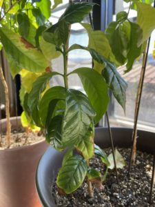 2月23日「天皇誕生日」、二日続いた猛烈な季節風は収まり、乾燥した晴天の青空に雪景色の富士山が美しく映えています。朝の冷え込みには真冬の厳しさがありましたが、昼間の日差しには確実に春の足音が感じられました。週間予報でも週末から最低気温はプラスに、最高は15℃以上と予想しています。コーヒーの子供たちにも待ち遠しい春が直ぐそこまで来ています。最近の様子ですが、異常に乾燥しているためか大きな古い葉が枯れ落ちて心配です。それでも画像の様にひこ生えが元気な緑を覗かせています。さながら世代交代の様相です。専門書を読むと、ひこ生えは元から剪定せよと有りますが、余りに元気なので切らずに様子を見たいと思います。