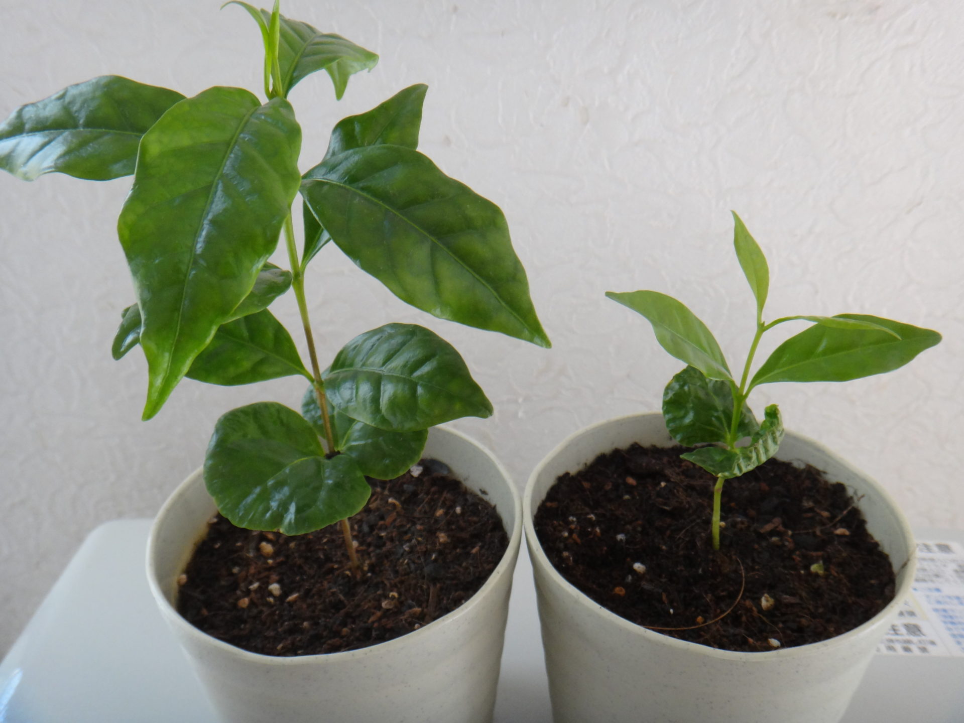 3月15日、3月に入って初めて氷点下の冷え込みになりました。昨日の雨が盆地を取り巻く山々では雪(清里で20cmの積雪)になり、良く晴れた今朝は標高1000m以上に砂糖を塗したような美しい景色が広がりました。幸い風が出なかったので寒さは感じられません。むしろ柔らかい日差しが心地よく、テレビや新聞を見ない限り、悩ましいコロナウイルスを忘れさせてくれる平和な春の一日でした。順調に生育している13ポットのコーヒーにも癒されます。そんな今日は余りにうららかな陽気なので、思い切って幼い苗たちを、初めて屋外に出して外気と春の陽光に当てることにしました。場所は日当たりの良い南向きのベランダです。その前にたっぷりの水やりが大切です。乾いた空気に当たって急激に乾燥するからです。写真は水やり直後で葉が少し下向きですが、3時間後に出先から戻ると元気な姿に戻り、日が陰った13時に屋内に取り込みました。