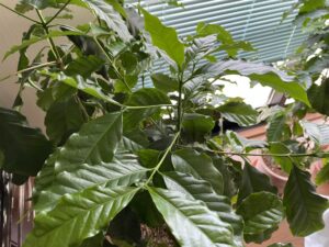 4月2日、早朝は少し冷えましたが、各地で真夏日に迫る暑さを観測した日曜日から季節は一気に春本番に突入しました。2月20日の異常な高温から一転して2月下旬から寒い日が続いていました。このためコーヒーの花は2輪咲いたのみ、他の花芽は堅いまま眠っていました。それが40日振りに今朝、3輪目が開花しました。花は小振りですが香りは強く、一輪で部屋中に甘い香りが充満していました。これから11月までが生育期となります。次の開花が楽しみです。