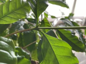 4月23日、雨は朝のうちに上がり午後は曇り空、気温は20℃台前半で快適です。湿度も70%位で、ちょうどコーヒーの産地と同じような気候です。この理想的な環境で過ごすコーヒーの子供たちですが、まだ少し眠いような感じです。と言うのは2月17日に見つけた季節外れの花芽に、あまり変化がないからです。それが毎日の観察では変化を感じられなかっただけで、改めて記録を調べると2mmほど膨らみ5mmくらいに成長していました。開花は焦らず気長に待ちたいと思います。
