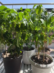 5月4日「みどりの日」、GW後半は乾いた晴天が続いています。ただ、この時期にしては気温が低目で、富士山も南アルプスにも残雪が豊富にあります。2週間前に新聞紙一包み程も大胆に剪定したコーヒーの子供たちはスッキリと、爽やかな姿になりました。葉の色も問題なく元気にしています。今日は少しの時間ですが、今年初めてベランダに出て、外気と日光浴を楽しみました。風にそよぐ葉が嬉しそうに見えたので、全員並んで集合写真を撮りました。葉焼けをしないよう20分ほどで室内へ戻します。これからは気温の上昇に伴い、室内の風通しに注意が必要になります。毎日の予想最高気温チェックが欠かせません。