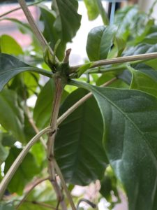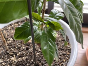5月19日、ゴールデンウイーク明けから続いていた梅雨の走りを思わせる天気が一転、昨日から高気圧ベースの晴天に変わりました。気温も5月らしい暑さに戻り初夏が感じられました。朝晩との温度差は激しいですが、元気に成長するコーヒーの子供たちには影響ありません。むしろ元気すぎて手に余るくらいです。背が高くなり過ぎないように頭を止めた切り口の脇から、新たな成長点(ズーム写真)が出て上に向かって伸びています。1ヶ月前に剪定した側枝からも脇芽が出始めています。きっと土の中でも根っ子が元気に伸びていると思います。幹も確実に太っています。強靭な生命力には驚きです。今日は緩効性肥料を少々と、たっぷりの水やり、他に特別な管理はいりません。