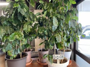 6月7日、昨夜は梅雨入りかと思うような本降りでしたが、一夜明けると朝から青空が広がり爽やかな天気です。甲府の予想最高気温は30℃と真夏日になるようです。それでも湿度が低めで気持ちの良い暑さです。ゴールデンウイーク明けから店頭に並んでいるコーヒーの子供たちも、快適な陽気に鮮やかな緑を一段と輝かせています。店の入り口は南向きですが、駐車場に屋根があるため直射日光に当たる心配はありません。また営業中は入口を開放して風通しも良く理想的な生育環境といえます。何よりお客様の「きれいですね」の声掛けに嬉しそうにしています。