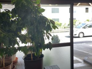 6月16日、青空も見えて梅雨とは思えない爽やかな一日でした。15時の気温は28℃で湿度40%、やや強い北西風が吹いています。人間にとって快適な環境はコーヒーにとっても理想的で、今は一年で一番の生育期となっています。枝葉をグングン伸ばし、土の中では根が元気に張っています。葉の色で分かる健康状態も問題ありません。管理のポイントは月1回の緩効性肥料と2日に一回の水やり、伸び過ぎた枝の剪定を行います。後は風通しを良くして病虫害を防ぎます。何よりも愛情を持って育てる事が大切です。