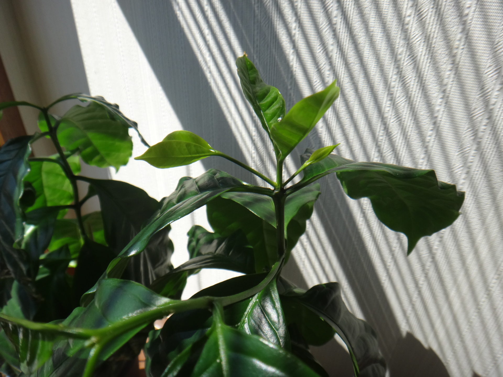 9月6日、九州地方に接近中の猛烈な台風10号による影響で県内も不安定な天気の一日でした。午前中は雨が降ったり止んだり、午後からは雲の切れ間から日が差しました。猛暑日記録を更新した8月が終わり、朝晩はずいぶん凌ぎやすくなって来ましたが、雨上がりの日差しで蒸し暑く不快な日曜日です。ここの所、成長が鈍化しているコーヒーたちですが、連日の暑さと強烈な日差しによる葉焼けを恐れて、部屋の中央に避難したのが間違えだったようです。ヒョロヒョロと背だけ伸びて「もやしっ子」のようです。基本に帰って考えたら答えは簡単でした。植物が生育する上で最も重要な光合成を失念しておりました。温度や風通し、肥料や水やりにばかり気を取られ一番大切な日光の管理を怠っていました。多少の葉焼けは覚悟で、南向きの窓辺に全員移動です。幸いしばらくは曇り予報の日が続きますから、強烈な直射日光の心配はありません。画像は現在トップで3本目の側枝が出ています。
