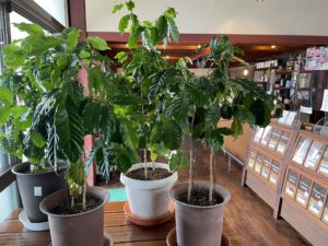 9月14日、9月も半ばにして最高気温34.5℃と猛暑日に迫りました。湿った気流の影響で湿度も高く不快な一日でした。そんな暑い日が続く甲府盆地ですが、今日は自宅に残した最後のポットを店に移送しました。さすがにテーブルに5個のポットを並べると少し窮屈な感じです。それでも12本のコーヒーが店の入り口に並ぶと存在感があるようです。お客様から色々とお言葉を頂き、ご注文のコーヒーのパックを待つ間にコーヒー談義が生まれます。最初の花が咲くまで5年位かかり、1本の木から一年間に収穫されるコーヒー豆は250g程度と知ると皆さん大変に驚かれます。また、温暖化による異常気象(干ばつ、降霜など)の影響で収穫量が大きく減少することがあります。植物(作物)を育てる大変さが身をもって感じられます。