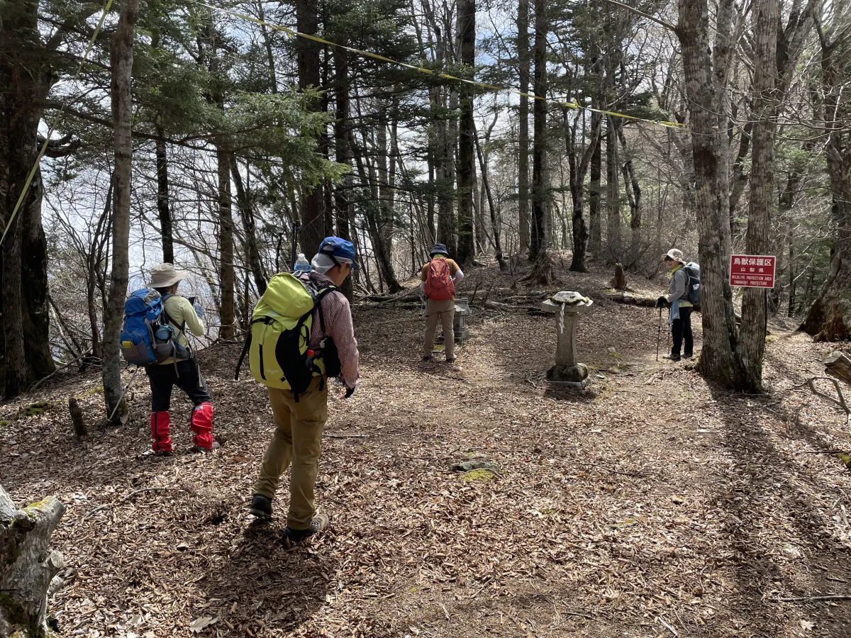 入会3年未満の新人会員を対象にした会恒例のリーダー研修が御正体山で開催された。昨年は滝子山のバリコースに参加したが、今年は会長から4班のサポート役を拝命した。総勢38名がバリエーション2コースを含む全7コースに分かれ12時の山頂集合を目指した。リーダーには計画立案から山行の実施、終了、報告までを体験してリーダーの役割を理解してもらう。4班は三輪神社からのコースで5名がピストンした。自身9年前に同コースを歩いているが断片的な記憶しか残っていない。幸いメンバーはリーダーも含め健脚揃いだから不安はない。標高差450mの尾根を直登する急坂はブナの落ち葉が堆積して滑る。やがて唯一の道標が建つ峰宮展望台(1568m)に着いた。ここで7班(ハガケ尾根)が合流し富士山をバックに写真を撮りあう。近くに祠が並ぶ峰神社に拝礼(写真)して本峰を目指す。全班12時前に登頂し全員で集合写真。またそれぞれのコースを下山した。TX三輪神社07:25~御正体山11:15 3+50