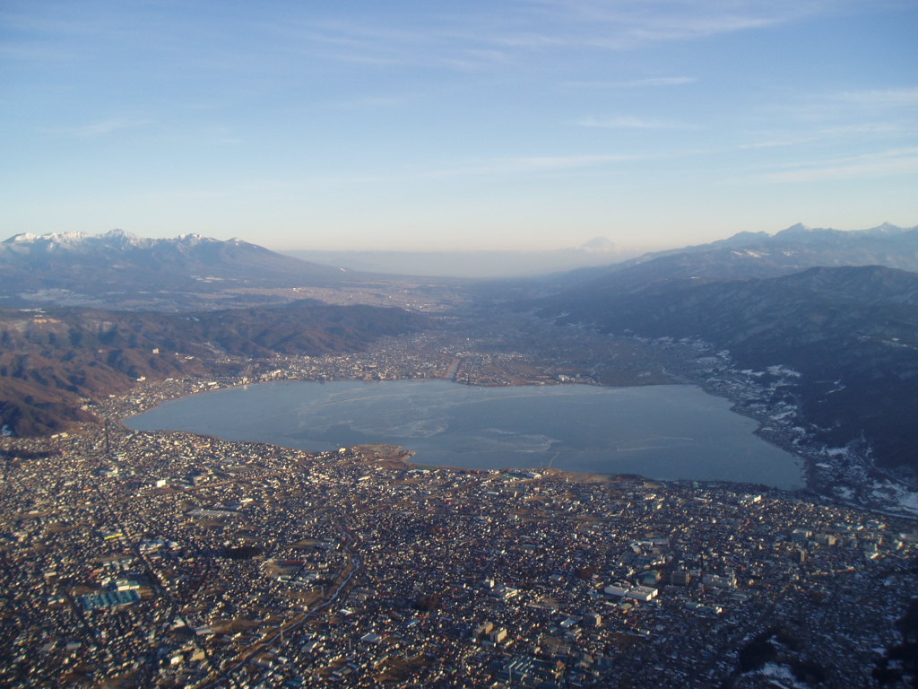 朝から穏やかに晴れて、成人の日を第二月曜日に変更したのは正解だなと考えながら、出勤して一人で事務仕事をしていると、上空にエンジン音が聞こえてきて思わず窓を開けた。事務なら夜でもできる、グライダークラブの友人T君に電話する「暇なら付き合わないか」、快い返事が返ってきたので14時に飛行場でと約束して、仕事に集中する。約束通りの時間に満面の笑みで現れた彼は、フーストソロを終えライセンスを目指して訓練中、今は操縦に精一杯で景色を楽しむ余裕も無いはずだ。たまには息抜きも必要だし、飛ぶ事の本当の楽しさを知れば、また訓練にも熱が入るだろう。日没時間が気になるので、エンジン試運転中の機内から携帯で松本空港の予約とウエザーチェック、富山から帰投した寮機の着陸を見て出発する。写真は、塩尻峠上空1800mから全面結氷した諏訪湖、手前は岡谷市で、左に八ヶ岳、右は南アルプス、中央の遠くに富士山も見える。帰路、清里に寄り道すると、甲斐駒ヶ岳に沈む美しい夕日を見る事ができた。双葉14:50~松本15:20 0+30