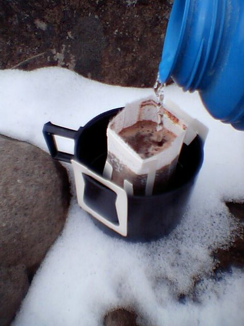 新年初登山の今日、誰も居ない山頂で30年前に買ったイギリス製のテルモス(魔法瓶)の湯でコーヒーをドリップ(写真)した。