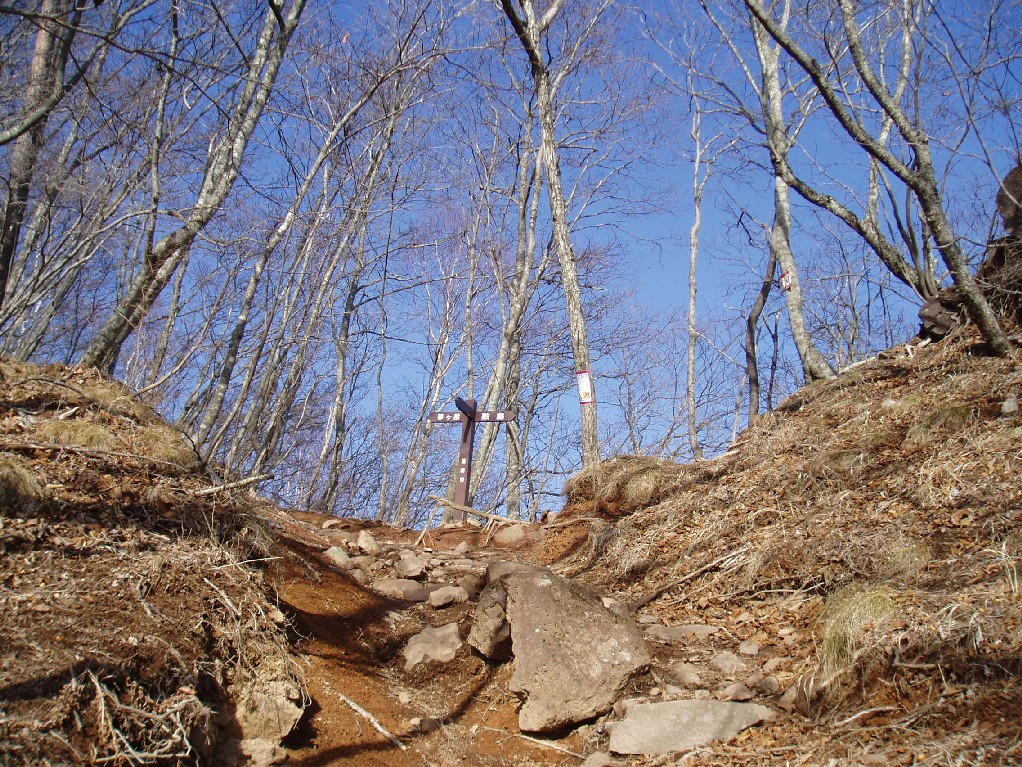 それまでの緩やかな道から一転して、女岩の水場を過ぎると沢状の急な斜面のジグザグ道に変り、このコース上で一番の辛い登りが始まった。さらに、この時期は足首まで積もったブナの落ち葉をラッセルしながらの急登で、滑る足元に気も使う。