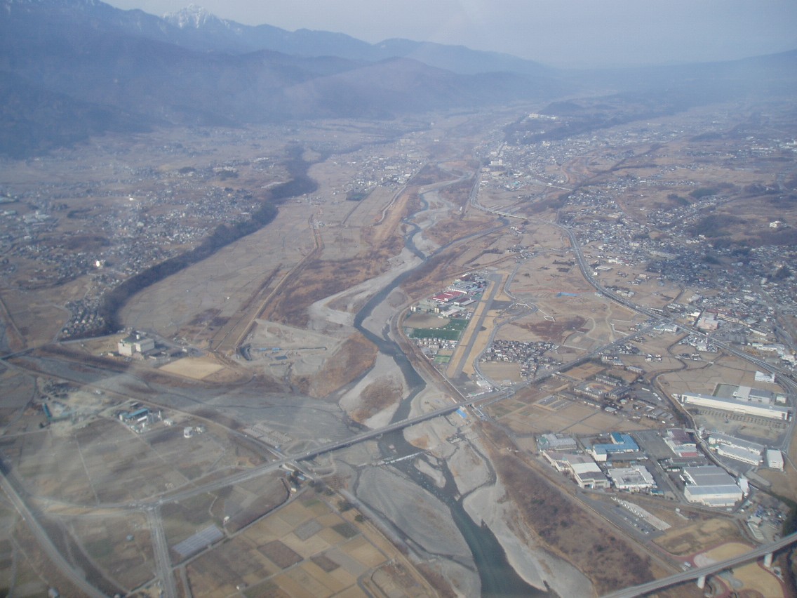 写真は、離脱直後で計器高度900m中央の釜無川を挟んで右に双葉、左上に韮崎の2本の滑走路が見えますか?