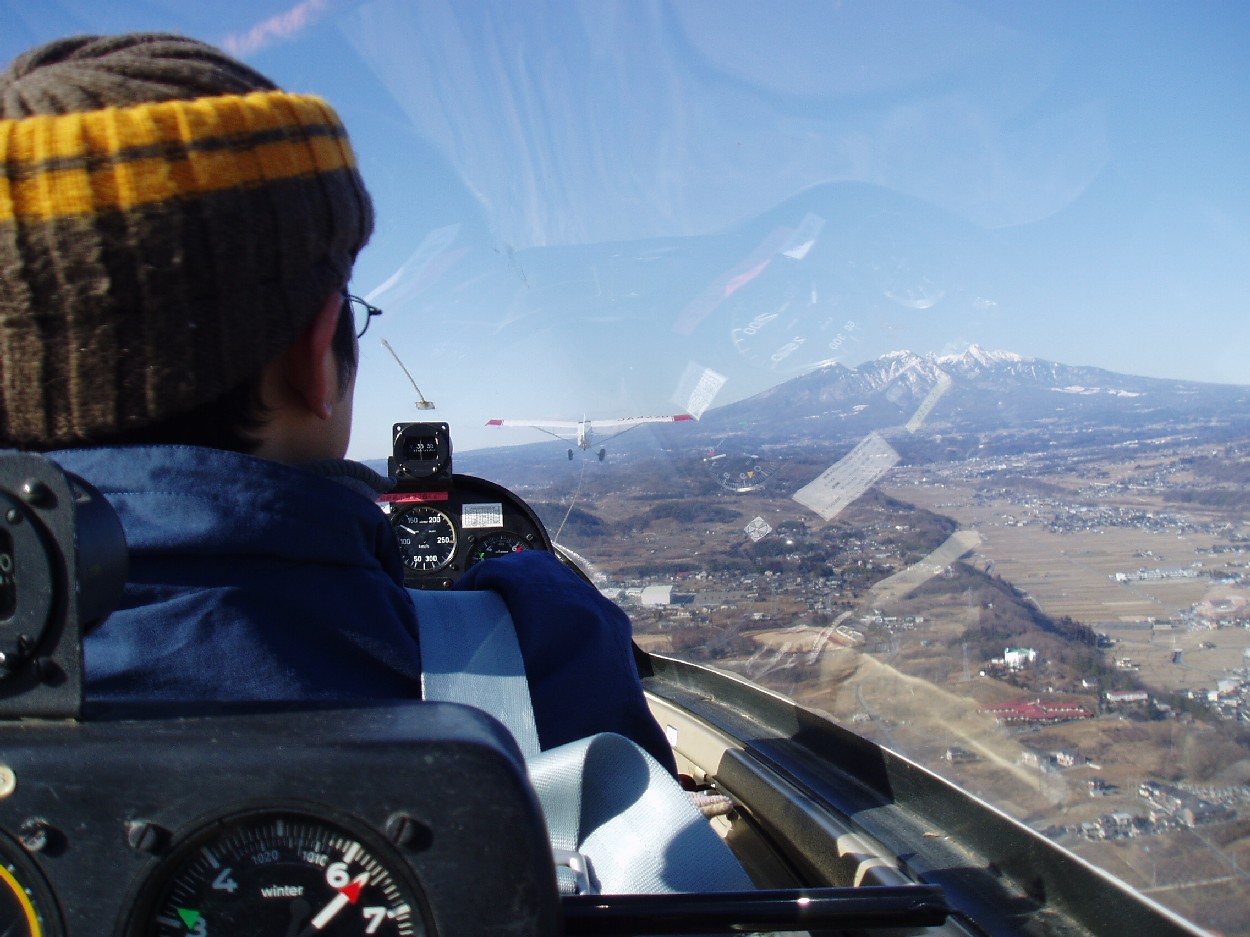 写真は、R/W32から離陸しアップウィンドを上昇中の後席から、ベテランK機長の右肩越しに撮影、高度計は630mを指し曳航機の水平尾翼がストラットの中央に位置して適正なレベルをキープしている事が分かりますね。
