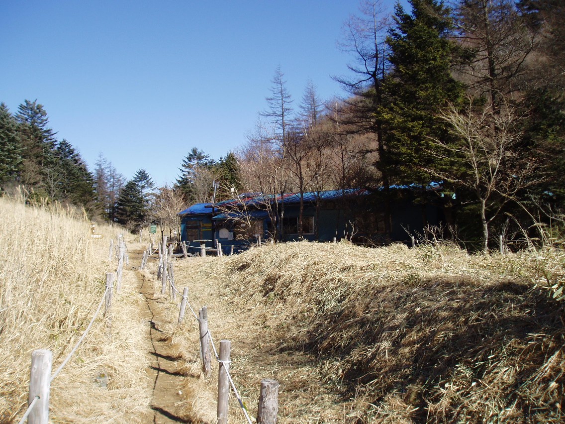 急な尾根道を登り切り、笹が茂る平坦な道になると青いトタンの丸川荘(写真)が見えて来る。(進行方向が柳沢方面で背面には富士山)