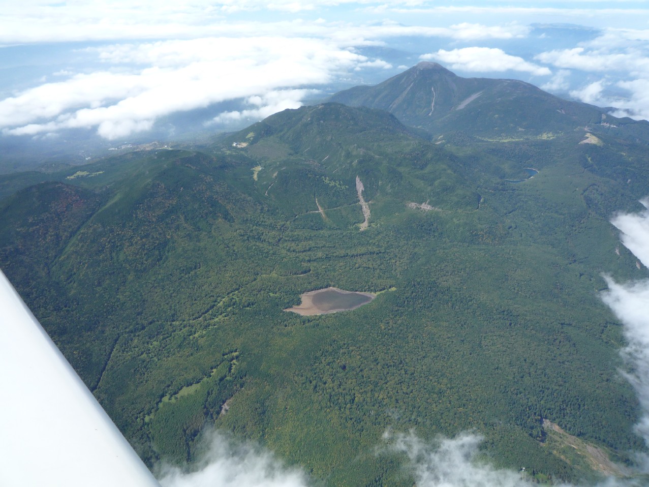 長く慣れ親しんだ八ヶ岳は地図に載っている道のほか、沢や岩のバリエーションルートまで四季を通して歩き、隅から隅まで知り尽くしている山域だが、こうして上空から見ると、改めて夏沢峠を境に南と北の山容が極端に違う事が良く分る。南八ヶ岳は急峻な稜線が連なり男性的な威圧感で迫ってくるが、対照的に北八ヶ岳は緩やかな森の中に池が点在(小海リエックス上空3000mから中央に半分干上がった雨池と前方に双子池、左翼に隠れてしまったが白駒池)し女性的な優しさが漂う。