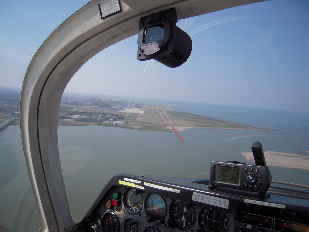 写真は、B滑走路R/W28にファイナルターンする右席から撮影した標高4.6ft(1.4m)日本で一番海面に近い滑走路で長さは2500m、まるで海に降りて行くようだ。