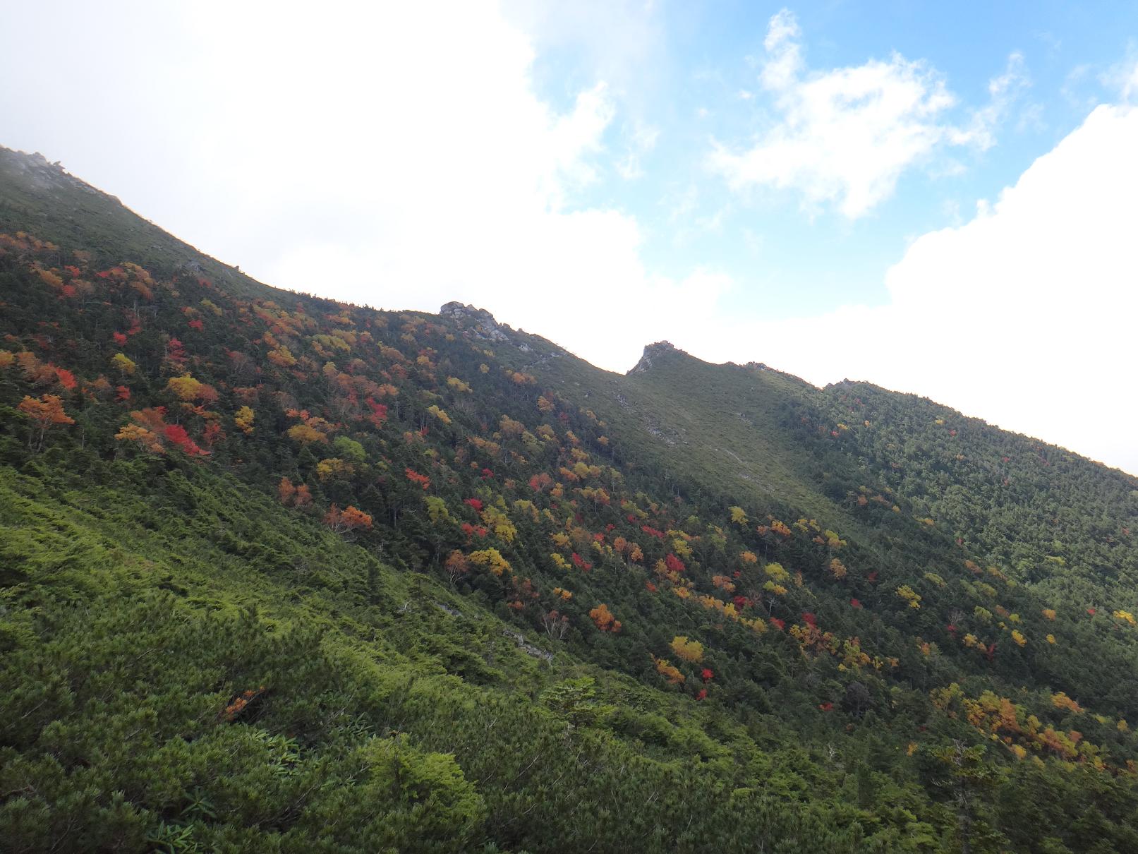 自治会の行事で登った春の茅ヶ岳が大好評で、今月14日に予定した金峰山にも20名の参加者が集まった。内訳は25歳~78歳(平均60歳)男12、女8名で半数以上が未経験者になる。山では体力の弱い者に合わせるのが鉄則なので、標高差が少ない大弛峠からのコースとし所要時間も5割増しで余裕の計画を立てた。だが、40年近く山をやってきても20人のグループを率いた経験はない。この10年間に金峰山には8回登っているが、このコースは5年振りになり本番を一週間後に控えリーダーの責任として万全を期す意味で歩いてみた。写真は、金峰山小屋からの金峰山の北面で紅葉は6~8部、快適な気温だったが終日ガスが掛かり遠望は皆無であった。初心者が大半なので緊急避難的な金峰山小屋の利用も想定し千代の吹上方面も周回して最新のコース状況を確認した。大弛峠09:35~金峰山11:35 2+00