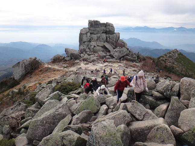 風を除けて昼食を摂った五丈石を背に下山を始めた我々(写真)巨岩が堆積する山頂付近の通過に細心の注意を払う。