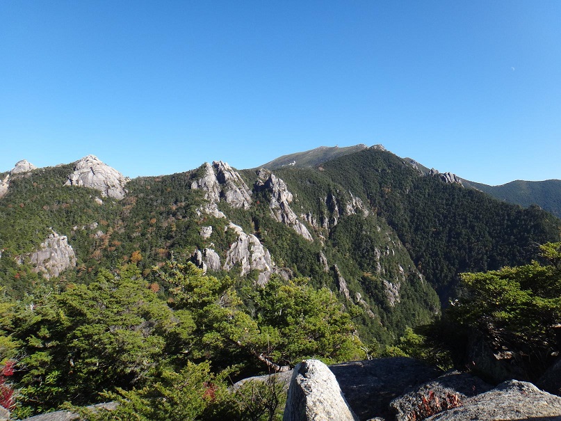 娘と二人だけで静かな2092mの岩峰から見渡す限り雲ひとつない秋の青空と二週連続で登った金峰山(写真)に続く稜線が見上げる高さに連なる。