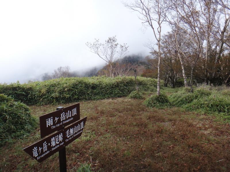 台風19号の大雨は県内の山岳にも甚大な傷跡を残した。端足(はした)峠までは特に問題なく眼下に本栖湖を、左手に竜ヶ岳を見上げながら高度を上げる。時折、雲間から日も射してきて10月とは思えない蒸し暑さに堪らずシャツを脱いだ。今日はクラブのY君が同行してタカデッキ(1921m)を計画した。タカデッキは二百名山の毛無山から稜線を北東に2kmほど、雨ヶ岳との中間地点にあるピークで360度の展望が開ける。山地図には南アルプスが全山見えると記され、一度は登ってみたかったが、熟達者の同行が必要ともある。予報は曇りだが「昼頃は晴れ」を信じて標高差1000m超の急登を頑張ることにした。それが端足峠で正面に現れるはずの富士山は霧に閉ざされ、期待は裏切られた感じだ。まあ、雨ヶ岳(1772m)までは登ってみよう。稜線上は風が通って涼しくて有難い。だが、台風と昨日の雨で道が川になって流れた様子で滑りやすく、強風で折れた小枝が散乱して歩きにくい。霧はさらに濃くなり今にも降り出しそうだ。途中の小平地で休憩中に2人組が下って来て、今日初めて人に会ったと声を掛けられる。物好きは自分らだけではなかった。峠から500mの直登は意外とキツイが、色付き始めたカエデが霧の中に凛とした姿を見せてくれた。ひょいと飛び出した山頂(写真)はクマザザが広く刈り払われ気持が良い。残念だが、タカデッキは次回にしよう。のんびり昼食の後で下り始めると小雨が落ちてきた。本栖湖09:10~雨ヶ岳12:00 2+50