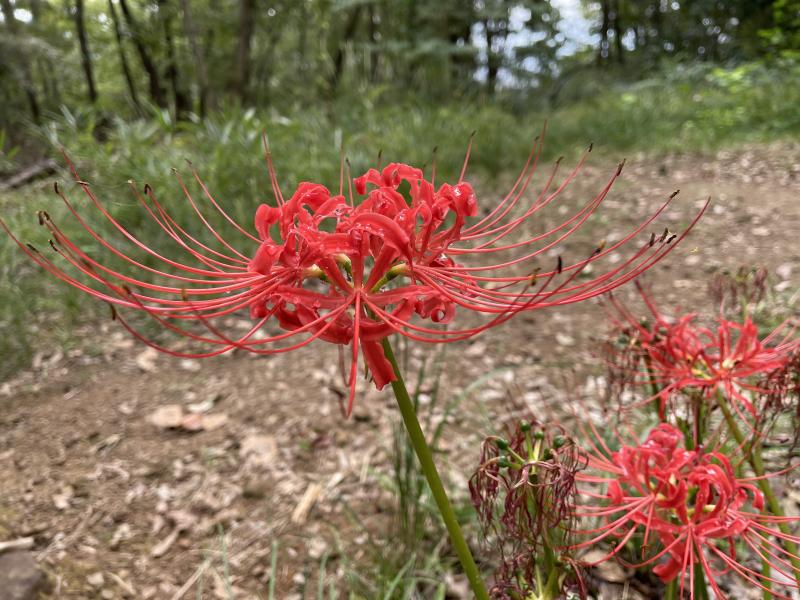 「暑さ寒さも彼岸まで」と言われてきたが、地球温暖化で、このことわざも死語になってしまうのか。彼岸が明けて二日後の9月28日には、甲府を含む全国4地点で最も遅い猛暑日を観測した。その暑い空気に包まれたまま迎えた10月のスタートは予想外の雨の音で目覚めた。予報を見ると雨は午前中にいったん上がり、15時頃から再び降り出すようだ。ゆっくりと朝食を摂り、予定していたホームマウンテン茅ヶ岳でのトレーニングを中止して、霧雨の中を緑ヶ丘に向かう。天気が悪くても体育館の駐車場は満車で何とか空きを見つけ、折り畳み傘を持ってスタートする。湯村山13分、濡れた路面コンディションにタイムは悪い。法泉寺山26分、今日も倒木迂回路を下る。コル31分、歩きながら給水150cc。第2東屋42分、トレランの青年が軽快に抜いて行く。八王子山47分、直後の急な下りで派手に滑って慎重になる。ゴールの白山は53分、24℃の暑さに耐えて、このタイムは上々だろう。毎年この時期に、湯村山の山腹にある送電鉄塔の基部に真っ赤な彼岸花が鮮やかに咲く。SM緑ヶ丘08:30~白 山09:23 0+53(24℃ 53.54.92)