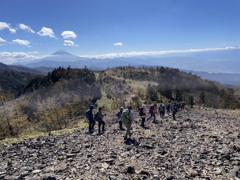 山の会が市民との交流を目的に開催している公開ハイキング、第6回になる今年は日本百名山の大菩薩嶺が会場となった。開催日の先週15日には総勢55名のエントリーが有ったが雨で延期になり、一般と会員を合わせて25名に減ってしまった。今日はこの秋一番の冷え込みで、文句なしの快晴となった。集合場所の大菩薩湖北岸駐車場には早朝から県外車両が続々と入り直ぐに100台以上が埋まった。開会式とストレッチの後で4班に分かれスタートする。先ずは大菩薩の表玄関口になる上日川峠まで上がる。峠の駐車場はすでに満車で、バスも増発便が出てピストン輸送の大盛況だ。何度も登っている大菩薩で初めて見る光景に百名山のブランド力を知る。渋滞の唐松尾根を頑張って、稜線の雷岩に上がるとここも大変な賑わい。最高点の嶺で集合写真を撮り、各班ごとに適当な場所で楽しいランチタイムを過ごす。スタート地点のダム湖の正面に富士山を、盆地を挟んで南アルプスの連山を一望する絶景を堪能する。下山はこの大絶景の稜線を緩やかに下って行く。写真は妙見ノ頭からザレ場を軽快に下るメンバーたち。 TX大菩薩湖08:45~大菩薩嶺11:20 2+35(唐松尾根)