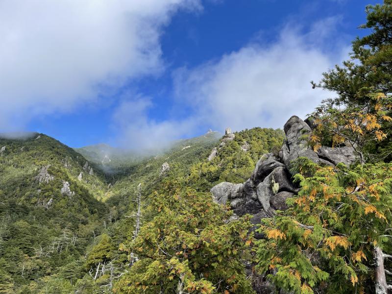 整備計画が進む黒平から金峰山に至る表参道がクライミング場で話題になった。まだ破線ルートだった13年前の真夏にアコウ平から一度ピストンした。今回はHさん、Tさんと3人で再訪してみた。大弛峠に1台デポし、アコウ平からスタートして荒川まで下る。前回は丸木が渡してあった2m位の川幅は5m位に広がり、靴を脱いで膝下の水位を渡渉する。道に迷った対岸はピンクテープに導かれて問題ない。歩き難かったゴーロの枯れ沢も、右手の樹林帯にピンクテープが続き難なく御室小屋跡に着く。前回は原型があった小屋も今は僅かな基礎に酒の瓶や空き缶だけが残る。小休止して等高線が混んだ急登の修行が始まる。ハシゴを登って岩峰に立つと前方に視界が広がる。片手廻し岩の左に目指す五丈岩は遠い(写真)。途中から雨になりカッパを着る苦行になる。それでも明瞭になった踏み跡とピンクテープでルーファイは格段に簡単になった。その分、修験道としての魅力が少し削がれた気がする。TXアコウ07:40~五丈岩11:10 3+30