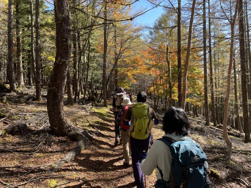 毎年秋の恒例行事になっている山の会が主催する公開ハイキング第7回が櫛形山で開催された。寒冷前線の通過が遅れた影響が残る霧雨の伊奈ヶ湖に総勢25名が集結した。相乗りでみはらし台に移動し、3班に別れスタートする。森の中に入ると木々の葉に溜まった霧が雨のように降ってきて、堪らずカッパを着る者もいる。北尾根には大量の栗とドングリが落ちていて濡れた落葉と相まってよく滑る。悪条件の中、2時間を費やしアヤメ平に着き花が終った木道を散策する。天気は回復に向かい青空も見えだしたので裸山からの白根三山に期待が膨らむ。それが残念なことに下界から湧き上がる雲に閉ざされ、一瞬微かに頭が見えるだけ。この時期の楽しみを探して櫛形山に向かうとチラホラと紅葉(写真)が始まっている。雨上がりの澄んだ空気の中、太陽の光を透かして見る美しい色合いは格別だ。今年の一般参加者は6名と少なかったが、その分きめ細やかな対応が出来たと思う。TXみはらし台07:50~櫛形山12:10 4+20
