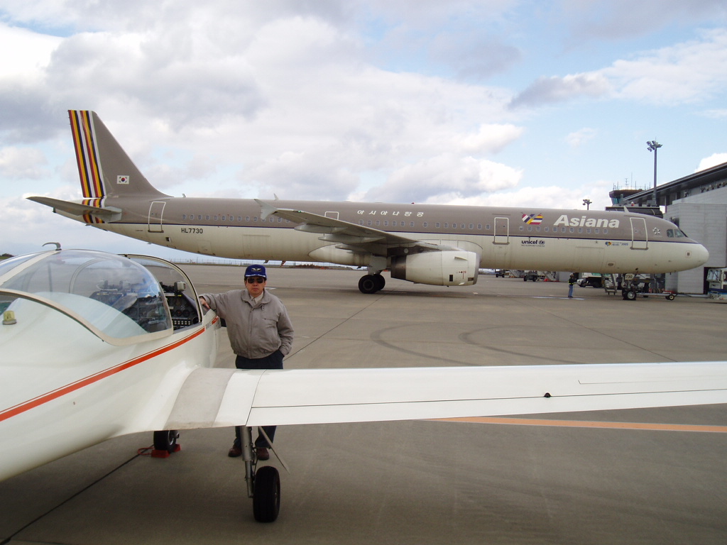 15年程前、所属していたJC(青年会議所)で空港建設運動を展開していた。グライダーの体験搭乗や、10人乗りのセスナ機をチャーターして伊豆大島への日帰り旅行に招待したり、市民に空港の利便性と航空機のスピード感覚を体感してもらった。そんな努力も虚しく県が出した回答は、地形的にジェット機の運航は不可能と言うものだった。50人乗りのプロペラ機で良い、今年開港したセントレア(中部国際空港)まで30分、空の旅が身近になり同時に、豊かな自然に恵まれた観光県山梨への集客率もアップするだろう。今日、訪れた福島空港は2500mの滑走路に国際線も乗り入れている。ターミナル前の駐車場は満車で、空港ビル内も活気に溢れていた。写真は、エプロン(駐機場)にて、バックは乗客搭乗中の13時発ソウル行き。やはり空の旅はロマンだな!双葉10:15~福島11:40 1+25