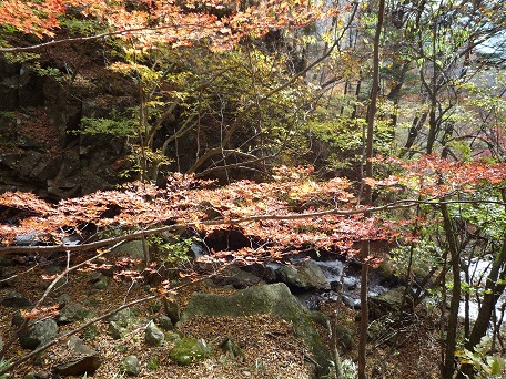 写真は、紅葉が見頃のズミ沢(モチヶ滝付近)で、笹子小学校が設置した道標がコースを導いてくれる。